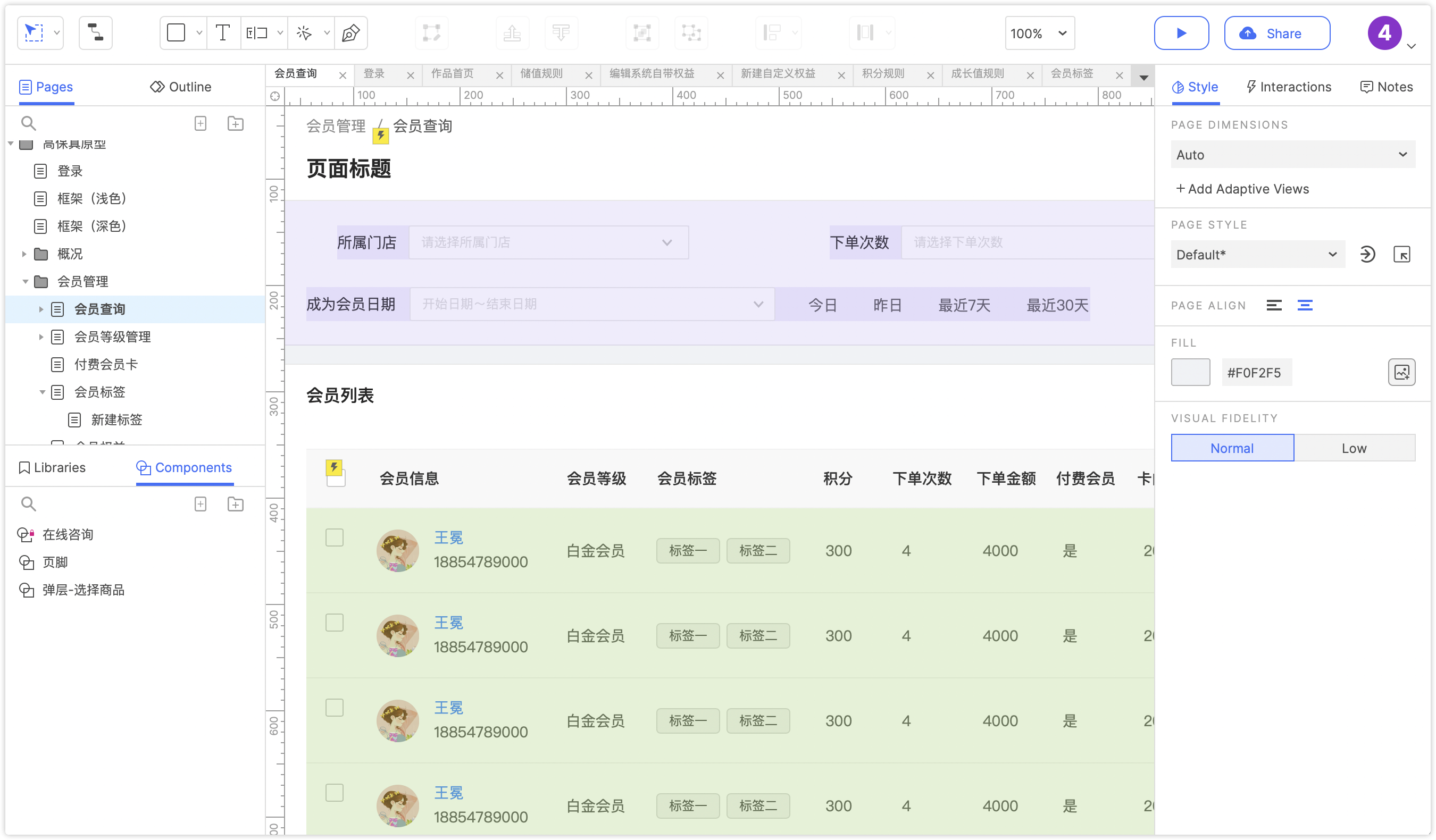 Axure是一款在国内知名度很高的原型设计工具,交互功能相当强大,几乎能模拟所有复杂的用户行为:条件判断、动态效果、数据交互……如果你需要展示高保真、可操作的原型,Axure是非常可靠的选择。