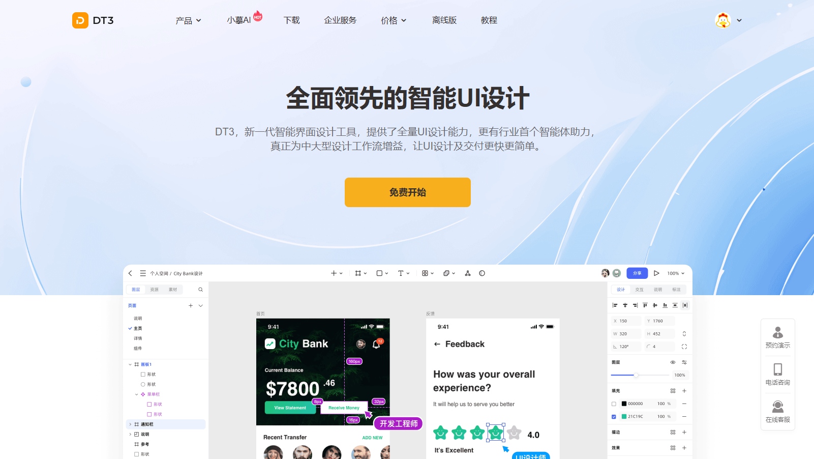所以,对国内用户来说,我更推荐DT3,一款新发布的智能界面设计神器,不论是使用习惯,还是功能覆盖度,它都很贴近Figma。更重要的是,它完全免费使用,还可以无限次体验AI一键生成高保真设计稿,极大地提高了UI设计师的工作效率。