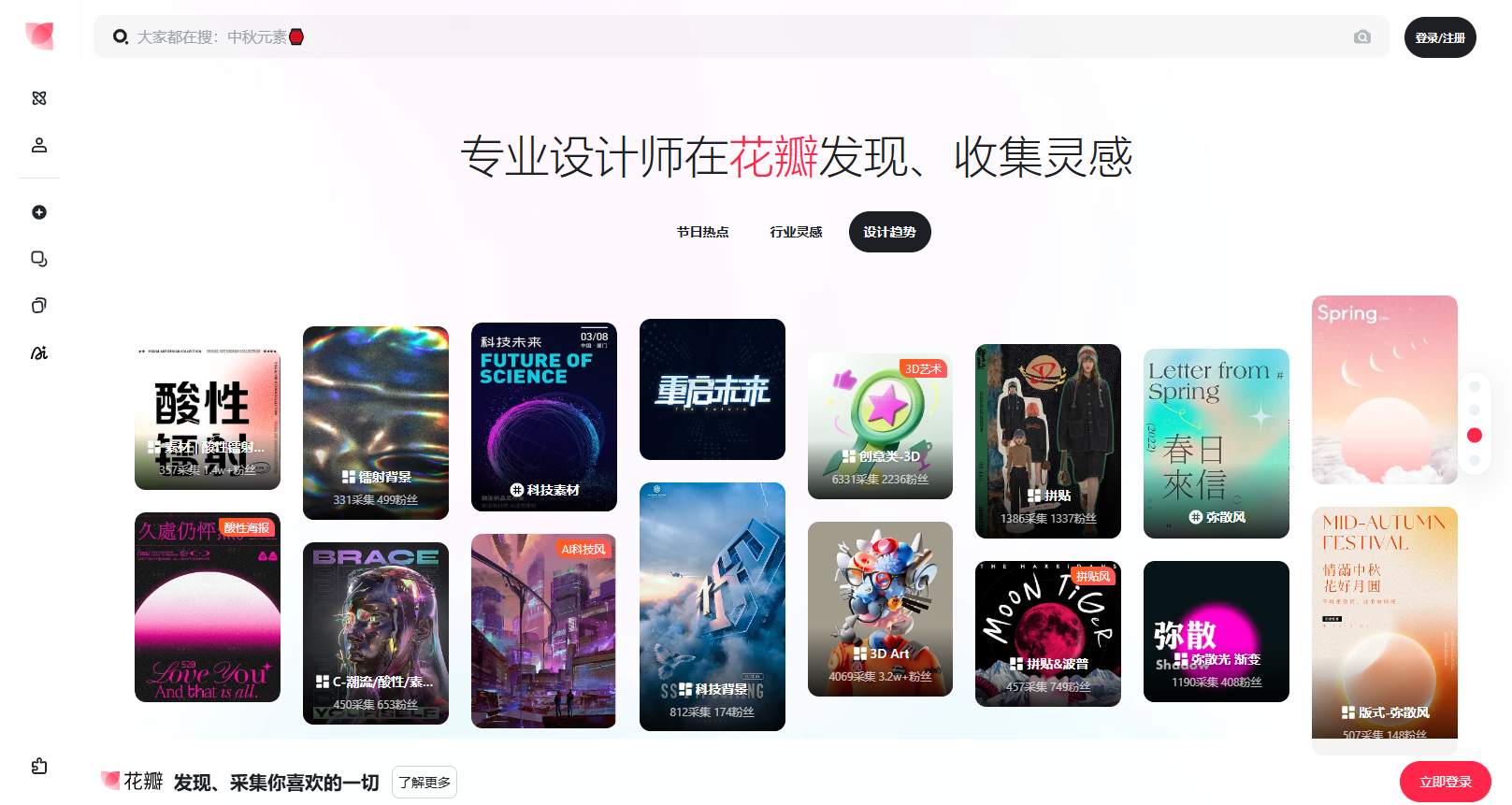 更重要的是,花瓣在素材质量、素材数量和用户活跃度上始终处于国内第一梯队,通过关键词就能快速找到所需素材,大大减少了寻找灵感的时间。