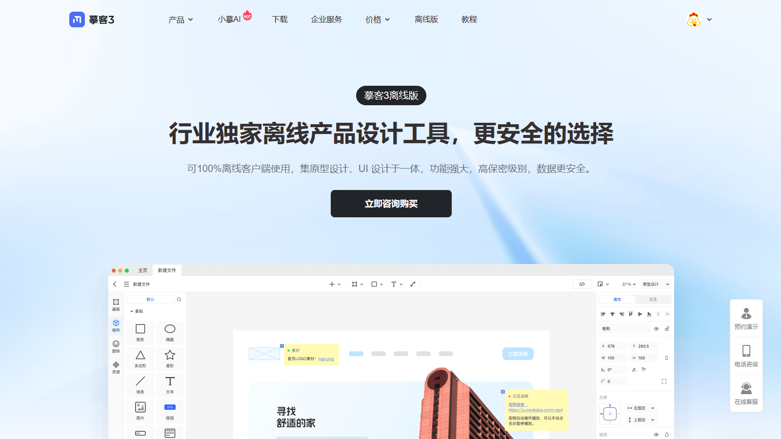 摹客3离线版是唯一可以全流程离线工作的国产设计软件,支持从文件创建、设计编辑到导出离线演示包进行本地演示、导出离线标注给开发查看,全流程所有操作均可在无网络环境下完成,无需依赖任何云端资源。 所有的数据都存储在本地,避免了任何数据泄露风险。