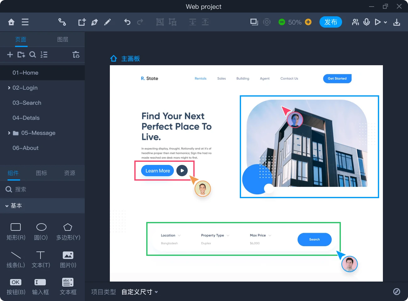 项目页面搭配主辅画板模式,自由创建弹窗、内容切换等网页中常见交互,轻松打造功能结构完整,流程清晰的网页原型